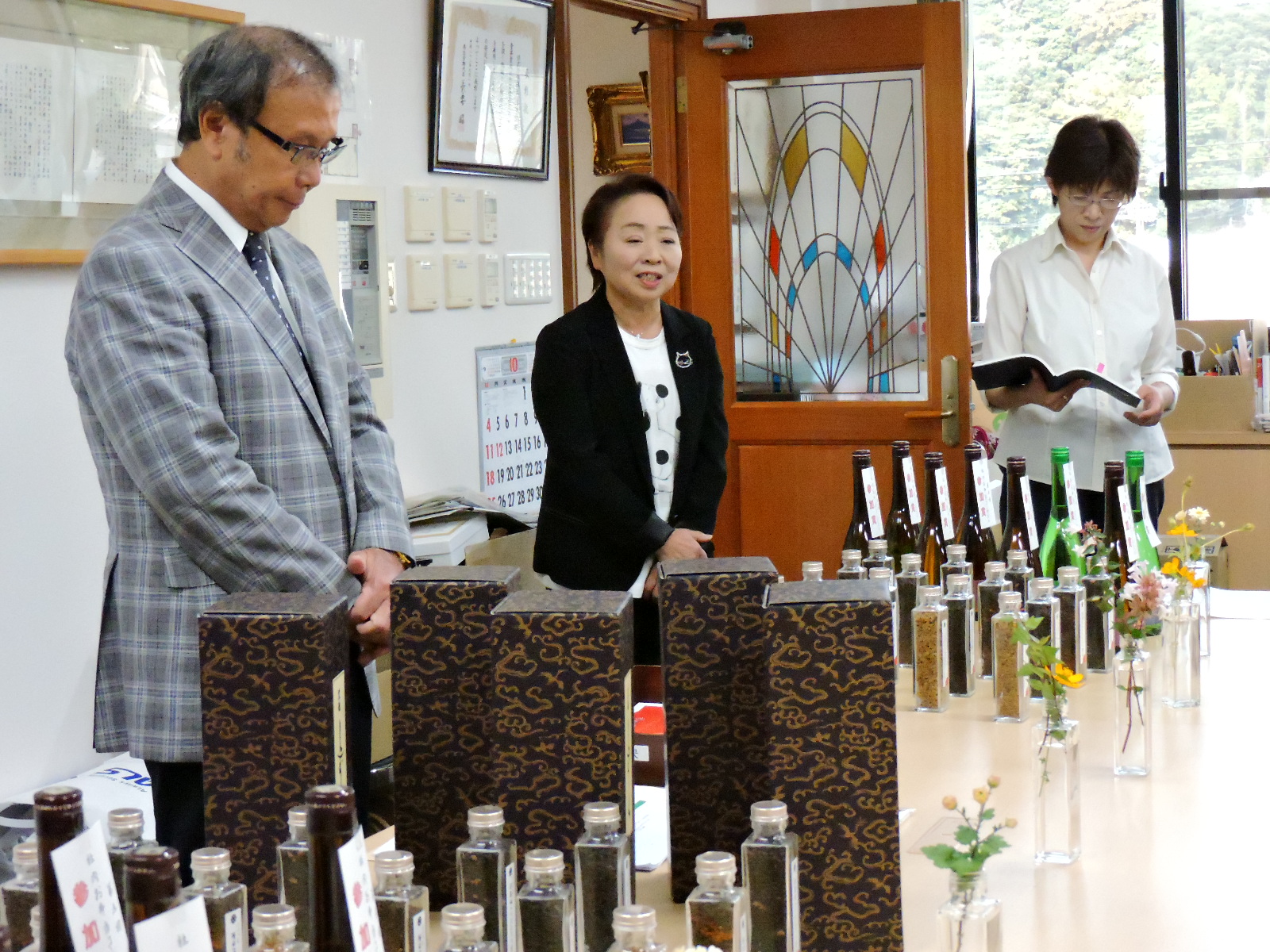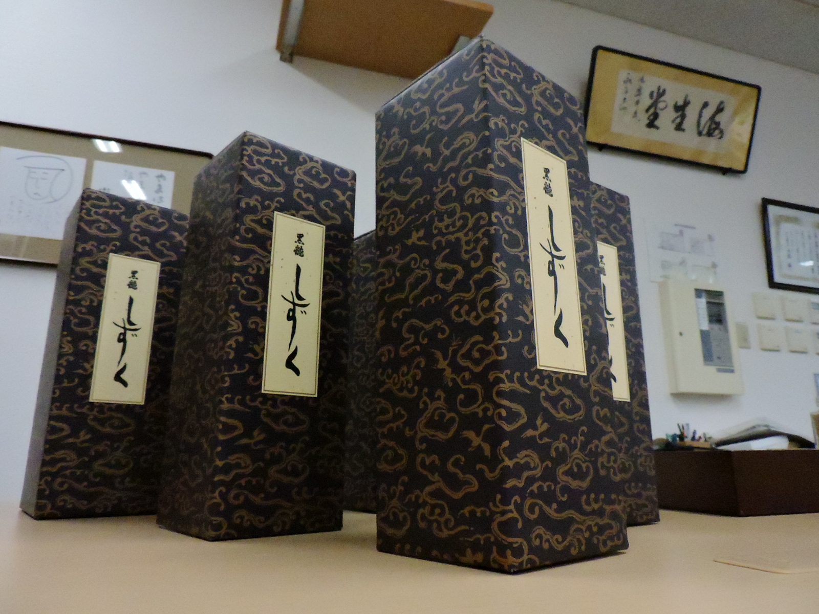 奥井海生堂3階事務所、会議テーブルの上には、何やら、いろいろと、高級商品が並んでいます。
