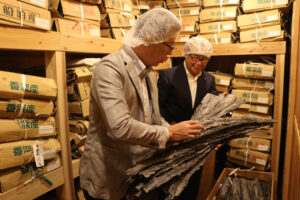 TOP > 「グランド ハイアット 東京」より視察のお客様がお見えになりました。 2025年10月10日(金) トピックス 「グランド ハイアット 東京」より視察のお客様がお見えになりました。 ツイート 東京・六本木のホテル「グランド ハイアット 東京」より根笹副総料理長はじめ3名のお客様がお見えになりました。 11月に同ホテル内の日本料理「旬房」で行う福井県の料理フェアで使う食材選びの参考にされると言うことです。 弊社社長による昆布についてのお話をお聞きいただいた後、蔵囲ヴィンテージ昆布の出汁試飲や昆布蔵見学、おぼろ昆布搔き実演をご覧いただきました。 この度は弊社にお越しいただきまして誠にありがとうございました。 ツイート 合わせて読みたい 2025年10月6日(月) トピックス ENGAWA株式会社さま、一般社団法人SOEさまが蔵見学にお見えになりました。 2025年9月19日(金) トピックス ル・コルドン・ブルー・ジャパンのジル・コンパニー氏が蔵見学にお見えになりました。 2025年9月16日(火) テレビ放送 トピックス 8月29日、世界最高峰シェフ、アラン・デュカス氏弊社「昆布蔵」へお見えになりました。 2025年8月22日(金) トピックス 【新商品】つぶっとふりかけ昆布が出来ました